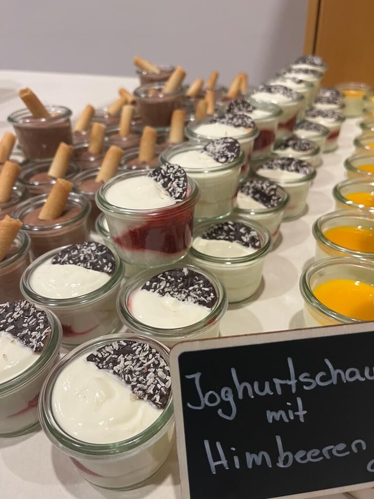 • Dessert: Spekulatius-Schokomousse oder gebackener Cheesecake mit Himbeerragout, serviert im Glas